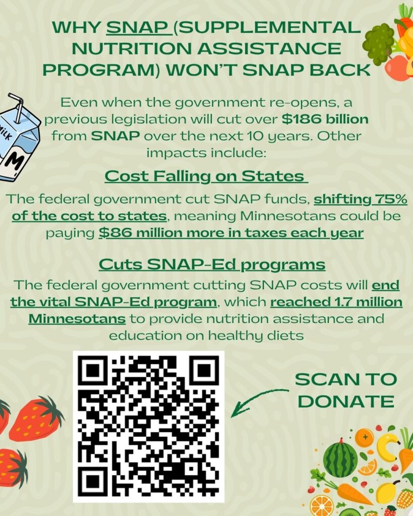 Over 440,000 Minnesotans rely on SNAP—including 152,000 children, veterans, and rural families. Recent legislation and the uncertainties under the government shutdown/reopening have significantly reduced SNAP benefits, putting additional strain on vulnerable communities.